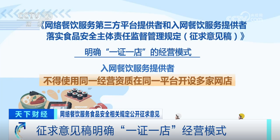 收罗看法稿明白“一证一店”的运营模式。采纳办法后私行恢复入网餐饮办事供给者线上运营办事的,平台该当正在网店首页加注“无堂食”标识。